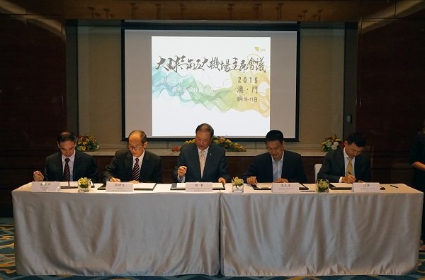 2015年大珠三角地区五大机场主席会议於9月11日在澳门召开。澳门国际机场专营股份有限公司(CAM)丶广东省机场管理集团公司丶香港机场管理局丶深圳市机场(集团)有限公司丶深圳机场股份有限公司丶珠海机场集团公司的领导和高级管理者领导齐聚澳门作交流及加强五大机场合作; 本届大珠三角地区五大机场主席会议由澳门国际机场专营股份有限公司轮值主办,主题为“创新互联,提升区域性竞合力”。