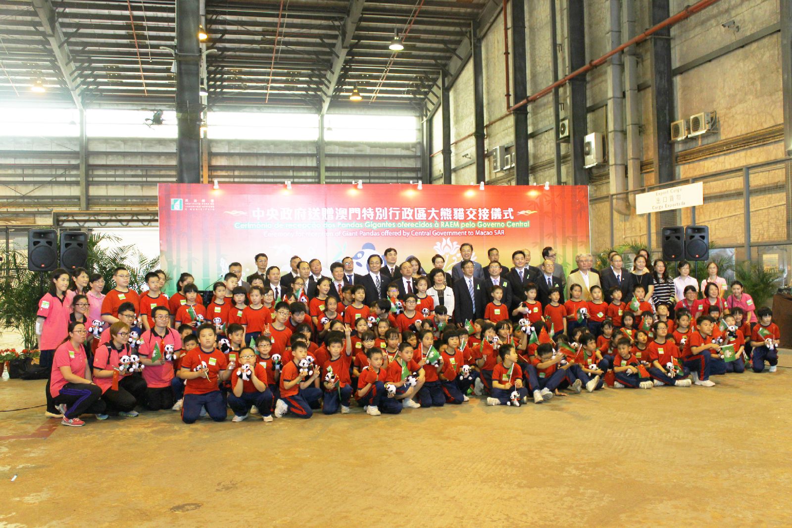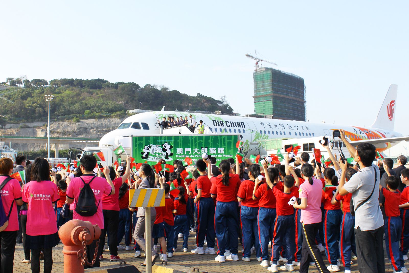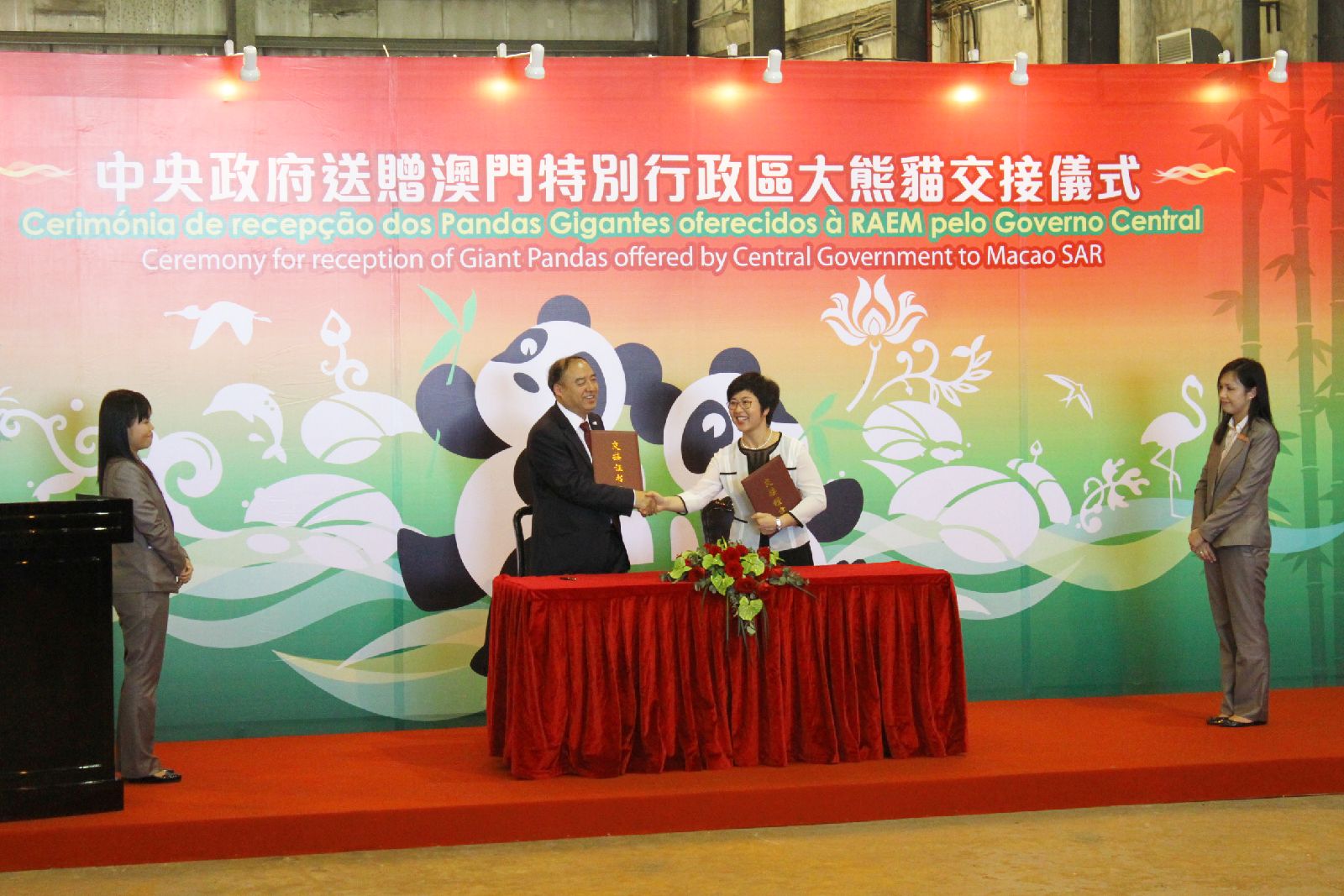2015年4月30日下午4时左右,中央政府赠送澳门的新一对大熊猫乘专机顺利抵达澳门国际机场,并举行简单而隆重的欢迎仪式,国家林业局副局长陈凤学与行政法务司司长陈海帆签署交接证书,象征一对大熊猫正式落户澳门。