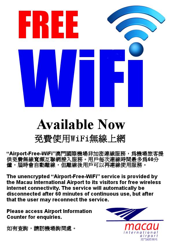 此外,考虑到用户对无线网络的需求增大,在今年一月,澳门国际机场正式为机场旅客及澳门市民提供全新免费无线宽频互联网接入服务,由原先提供每天一小时之免费无线上网服务,提升为无限次免费无线宽频互联网接入服务。为免资源被个别长期占用并让服务被普及性轮流取得,故每次连线时间设为一小时,於需要时用户在每次离线後可再次连线及继续使用服务。除此之外,按照使用需要,用户可以选择加密及非加密连线服务,加密服务之用户名称及密码为“mia”。为更贴合旅客的服务需要,已安排专人在机场询问处为用户解答各种使用上的问题。
