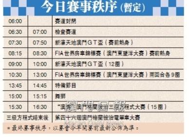 【本报消息】第五十九届澳门格兰披治大赛车今日大战连场,三大重头戏——三级方程式丶世界房车赛丶格电大赛将决出今届东望洋王者,由超级跑车角逐的澳门GT杯同样不容错过。三级方程式决赛料属一衆欧洲车手之争,究竟去届冠军西班牙车手真卡迪拿能否卫冕,继意大利车手莫他拿後成为第二位连夺两届冠军的车手,今日下午自有分晓。