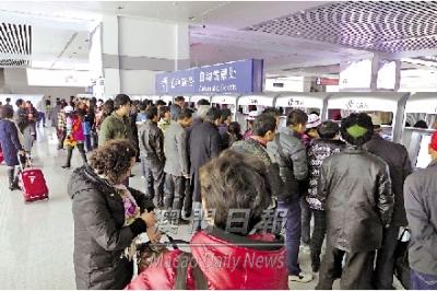 港澳居民用回乡卡自助购票的功能昨日仍未能正常运作,自助售票机上读取回乡卡数据的卡槽形同虚设,港澳居民需到人工售票厅购票。自助机的“碌卡”购票功能亦未有开通,乘客需支付现金。二十九台自助售票机昨日仅有十二台投入使用,众多购票者一涌而上,秩序混乱。