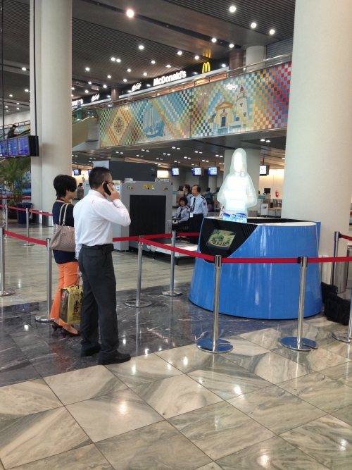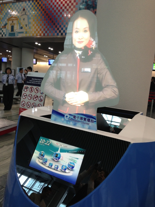 澳门国际机场一直以来以客为尊,并推进机场服务虚拟化和便利化,以提高效率。为提高旅客对澳门国际机场服务设施的了解,澳门国际机场重金打造了这块虚拟人型互动客服立牌,於2013年3月25日开始放置於机场出发大厅的当眼位置。这位搭配女声的虚拟人型互动客服立牌采取真人尺寸投影,用普通话丶粤语丶英文丶三种语言协助引导旅客清楚了解到达办理登记柜台丶安检登机通道丶休息室丶洗手间等机场设施的路径或是告知乘机的相关谘询等。