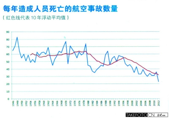 事实上,自1997年以来,重大航空事故量便一直呈下降趋势。去年,平均每250万次飞行才会发生一起致命空难。在美国,自2009年科尔根航空3407号航班在纽约水牛城坠毁之后就再没有发生过造成重大人员伤亡的严重事故。而中国近9年的优异航空安全现状更是让全世界刮目相看。直到2010年8月。河南航空一架ERJ-190在黑龙江伊春失事,才结束了中国民航安全飞行2010天的纪录。