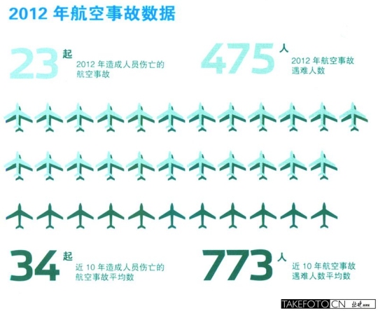 另外还有一个能让你安心乘坐飞机旅行的好消息:2012年是全球空中交通最安全的一年。据荷兰独立机构ASN航空安全网的统计,去年全球共发生了23起重大航空事故,造成475人(包括机组人员和乘客)遇难和36名地面人员遇难,是自50多年前喷气式客机投入使用以来数字最低的一年(近10年,平均每年发生重大航空事故34起,造成773人遇难)。这23起空难涵盖的机型包括货机、用于运输极限跳伞者的飞机、展示飞机等,其中只有11起空难发生在民航客机上(近10年,平均每年16起),这同样是有史以来最少的。