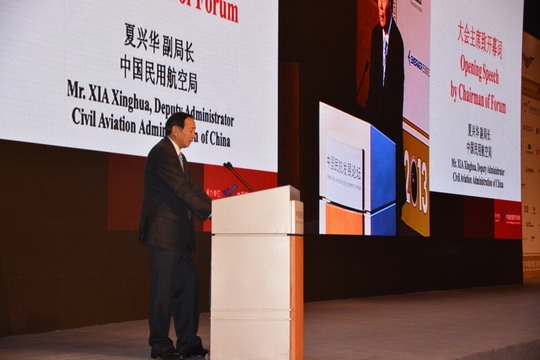 图1:5月16-17日,以“航空经济与环境保护”为主题的 2013 中国民航发展论坛在北京隆重开幕。图为民航局副局长夏兴华致开幕词