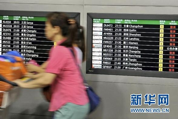 图:7月5日,浦东机场候机大厅一块屏幕显示大批航班取消。受天气影响,7月5日16时上海虹桥机场和浦东机场大量航班延误。因有大量旅客滞留机场,当天计划21时以后经上海浦东、虹桥机场出港的国内航班全部取消。新华社发, 摄影:杨夏杰