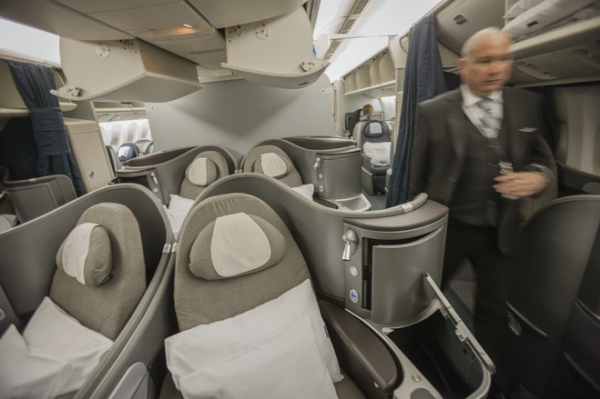 图3:航空业咨询师、曾加入环球服务计划的亨利·哈特维尔德(Henry Harteveldt)说:“它有充足的商业道理,因为那些人是航空公司最大的金主。当某些事情成为品质象征时,它的重要性就会高出许多。。”图为美联航一架波音777(Boeing)飞机的头等舱。