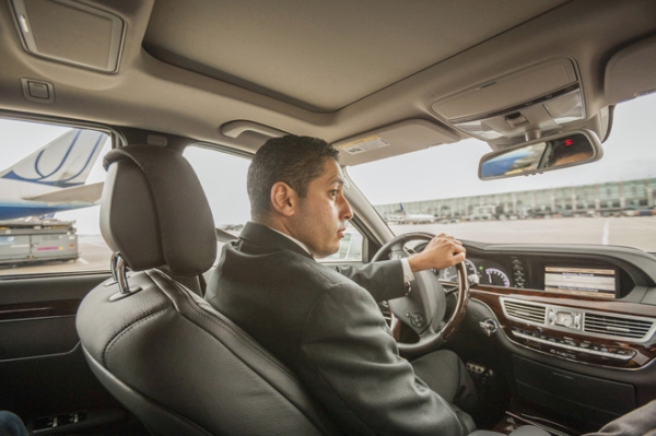 图6:在奥海尔机场,每天经过该机场的45,000名旅客中大约有100人可进入全球头等舱活动室。它为疲倦的旅客提供淋浴服务,并赠送免费的香槟。图为贾拉勒·穆克塞特(Jalal Mouqsete)驾驶着美联航的奔驰班车。