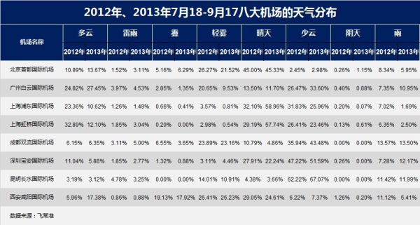 图3:2012年、2013年八大机场7月-9月天气分布对比图