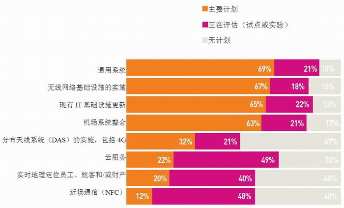 48%的受访机场预计将在未来3年通过实验和试点研究评估云服务,而40%的受访机场计划着眼于近场通信的建设。