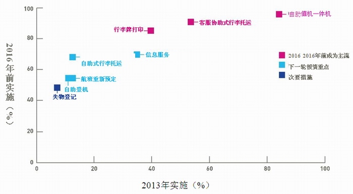 这就使得各大机场将建立自助行李托运站作为投资的首选。目前,已有54%的受访机场部署了该项服务,在2016年年底前,这一比例将升至90%。