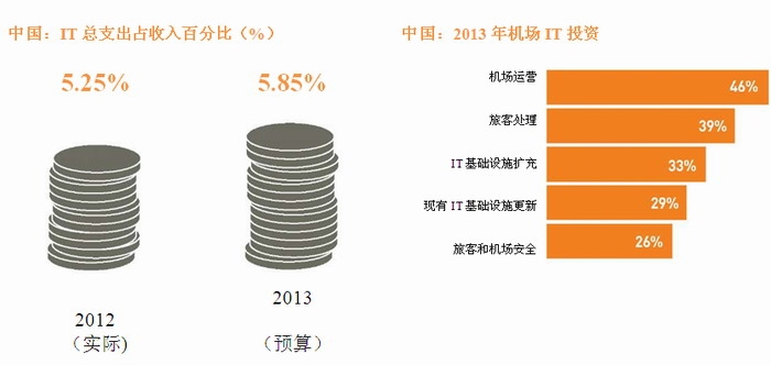 调查显示,中国主要机场的总IT支出与中国经济高速发展一致,2012年保持在较高水平,占收入的5.25%,远高于2012年全球平均水平。