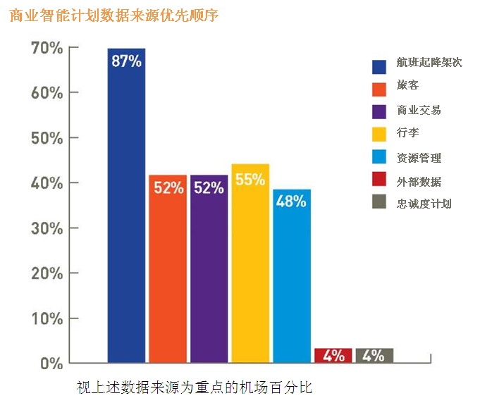 提高运营业绩是该领域优先考虑的重点,87%的受访机场认为,飞机起降架次数据是商业智能信息的主要来源。