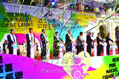 大巡游昨日下午三时半在大三巴牌坊耶稣会纪念广场举行起步礼。行政长官崔世安,中联办副主任陈斯喜,外交部驻澳特派员胡正跃,社会文化司司长张裕,秘鲁驻港澳总领事大卫 · 马拉加,葡萄牙驻港澳总领事薛雷诺,行政长官办公室主任谭俊荣,国家文化部港澳台办主任张爱平及文化局长吴卫鸣共同主礼。多个政府部门代表及拉丁语系国家驻港澳及广州领事馆代表亦见证盛会。
