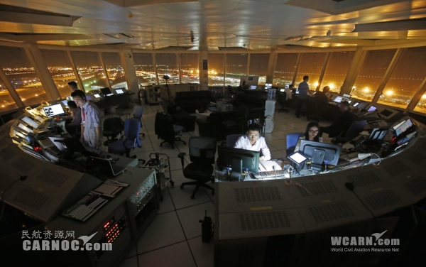 图:夜晚的浦东机场格外迷人,虽然外面天色已然全黑,塔台里却不允许使用灯光,这是为了不影响管制员对场内灯光的判断。摄影:殷立勤