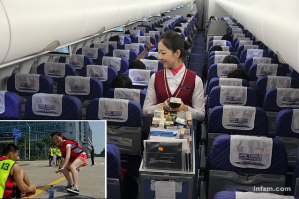 图:安全员属于机组成员,部分兼职安全员还要承担客舱服务工作。比如图中这位安全员,大图显示她在国际航班为旅客提供服务,小图显示她在参加安全员训练。