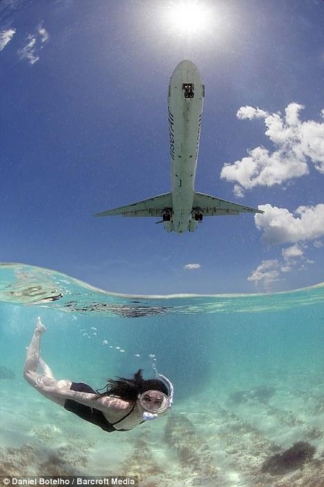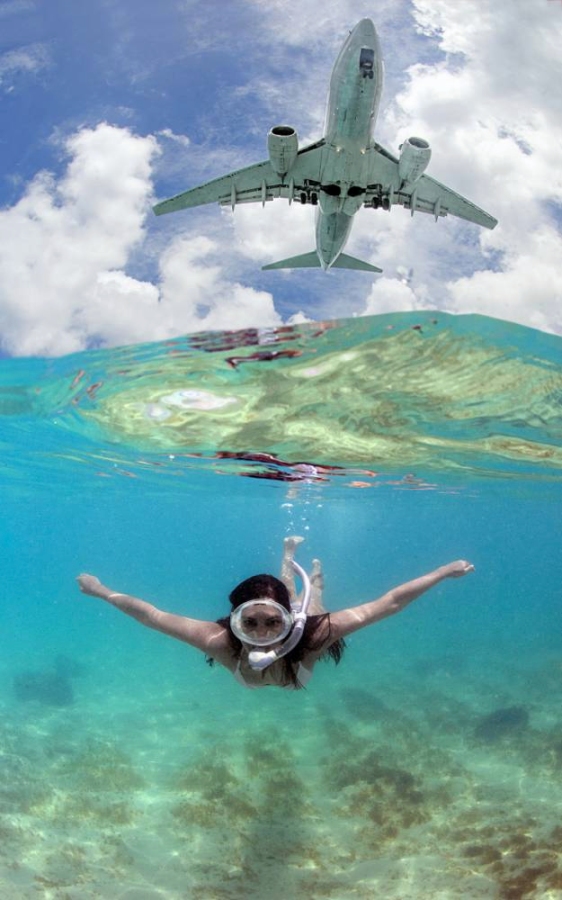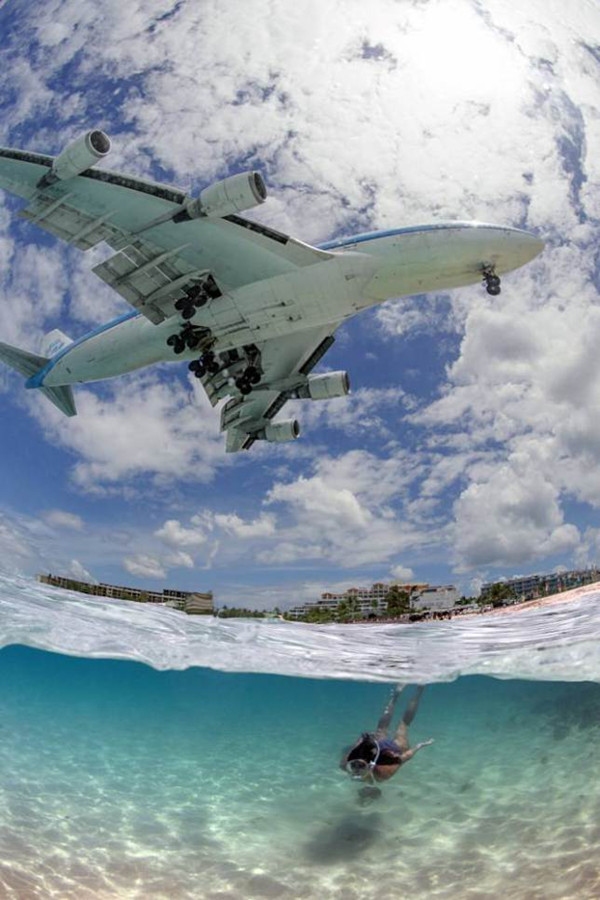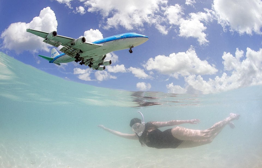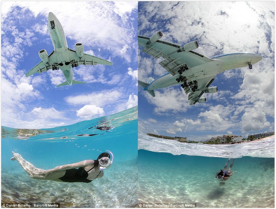 据《每日镜报》,大部分前往加勒比海的游客喜欢在沙滩上享受阳光浴,静静地聆听大海的呼吸和海浪拍岸的声音。但是在荷属安帝列斯群岛圣马丁岛的Maho海滩上,飞机降落的轰鸣声让这一切都变成了噩梦。不过,在另一些人眼里,低处飞行的飞机掠过在水底畅游的游客头顶,这画面也很美很有趣。因此,这一片不怎么招普通游客喜欢的海滩却成为了飞机爱好者的理想目的地,33岁的巴西摄影师丹尼尔-博略特就是其中之一。为了捕捉到最完美的镜头,丹尼尔每天要在水里待8个小时。