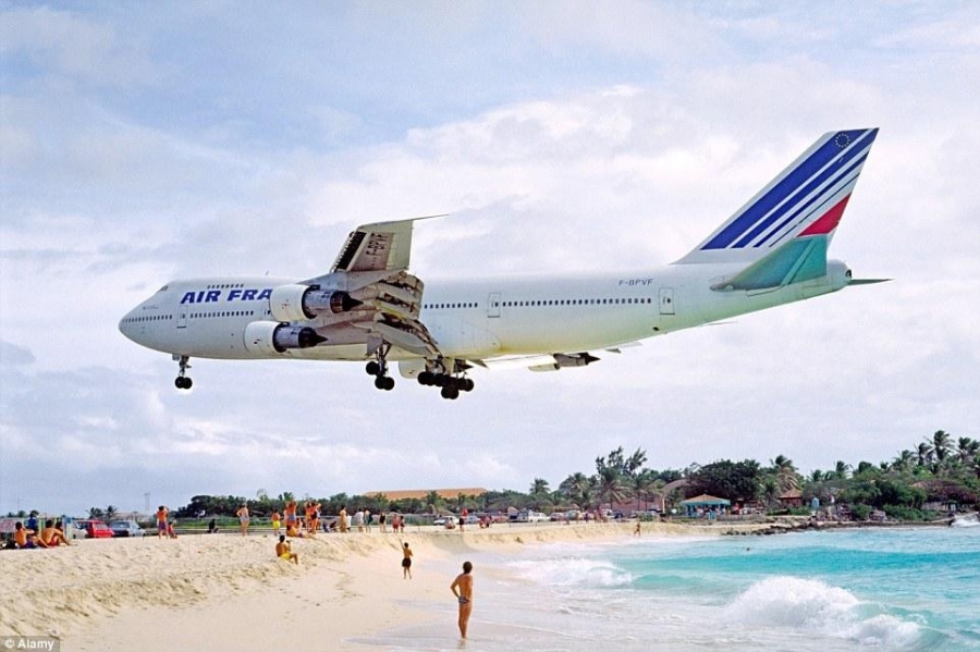 圣马丁岛的朱莉安娜公主国际机场离Maho海滩的距离非常近,机场的跑道又是世界上最短的跑道之一,所以,飞机不得不在很低的海拔处降落。