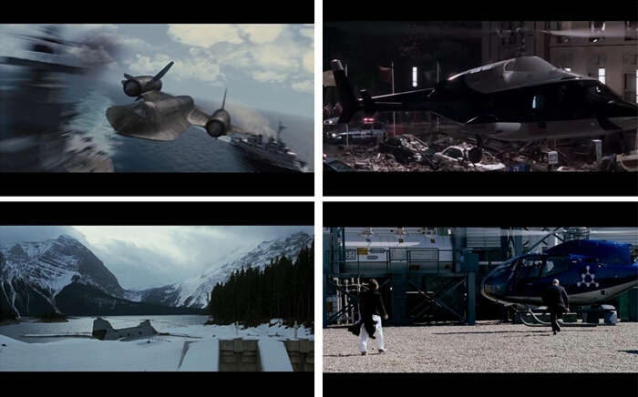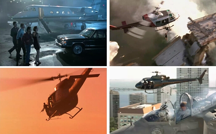阿诺在《真实的谎言》(True Lies)和《蒸发密令》(Eraser)中,均是中情局的雇员。《真实的谎言》也可称得上是各种飞机秀。除了最后阿诺驾驶着“海鹞”单挑大反派之外,“贝尔206”、“贝尔412”等均粉墨登场。阿诺和太太自摆乌龙被抓走时,坐的是“湾流III”,而他的中情局同事在空中用于监视的,也是一架公务机改装的飞机。