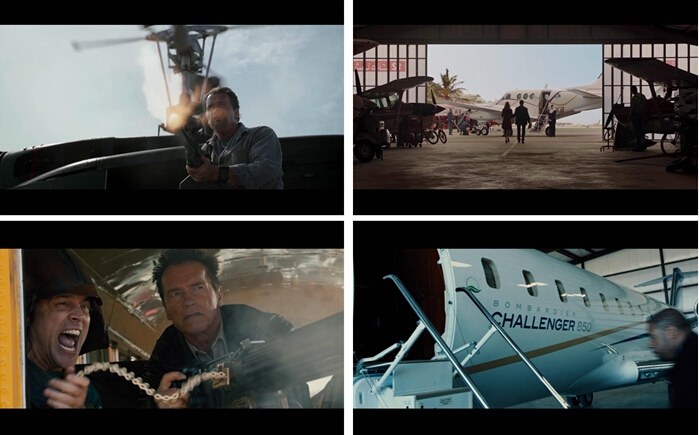 2013年阿诺卸任加州州长之后,仍然不懈地奋斗在影坛,尽管有些英雄迟暮,但飞机和机枪的戏份可是一点不省略。《金蝉脱壳》(Escape)中,阿诺召唤来“UH-1”,端起机枪对着敌人一通狂扫(叫你们虐待州长!),大团圆结局时,“空中国王C90”也有出镜。《背水一战》(The Last Stand)的海报就是化身小镇警长的阿诺端着机枪,期间“贝尔206”跟丢了嫌犯,反应迟钝的警方总部则是坐着“挑战者850”赶赴边境。等等,为何飞机涂装是原厂的,还这么新,估计是制造商友情赞助的吧?