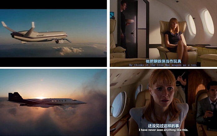 《钢铁侠》(Iron Man)系列也很另类,小唐尼一直在突破物理学原理,能只身横削“F22”战机后依然谈笑风生。公务机在《钢铁侠》系列中均有亮相——作为世界第一大军火商,拥有飞机理所应当。有趣的是,这些飞机都是外型独特的概念型飞机,不过镜头一转,客舱就暴露的真身,《钢铁侠》1和2中应该用的是“波音BBJ”,而《复仇者联盟》中的那独特的扁椭圆型舷窗就暴露了真实机型——还是“湾流G450”。