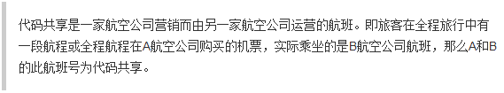 如:国航和汉莎在北京和杜塞尔多夫上的代码共享,虽然只有一个飞机,各自持有航班号,由国航来运营。