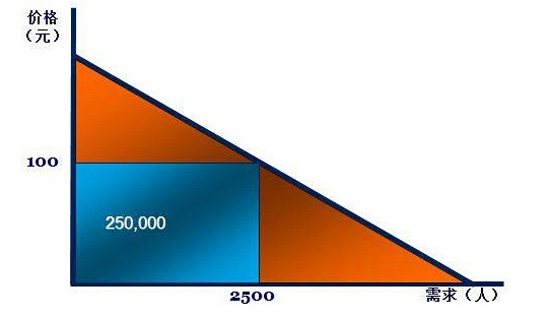 需求法则告诉我们需求量同价格变化成反比!我们先假定市场是理性的(毕竟壕们和急需乘坐飞机的乘客是不会考虑价格的),那么,我们如果想要收益最大化,就要找到一个最优点。对,就是这个点,100块一张机票,2500个乘客,受益250000。(显然是不够的)