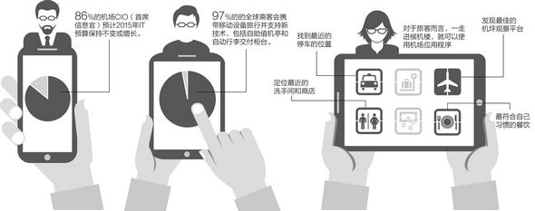 竞争意识很强的机场都渴望应用这些技术。SITA最新的机场IT趋势调查显示,86%的机场CIO(首席信息官)预计2015年IT预算将保持不变或增长。97%的全球乘客会携带移动设备旅行并支持新技术的应用,包括自助值机亭和自动行李交付柜台。