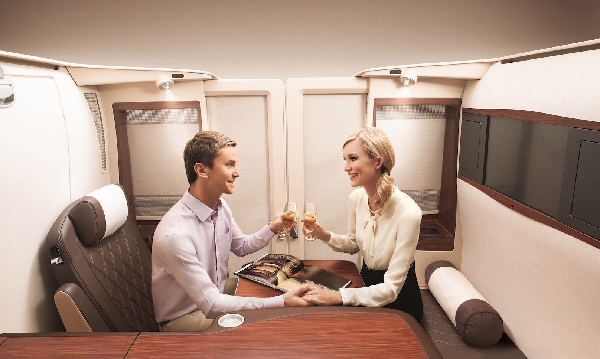 A380飞机就是最顶级空间与奢华的代名词。新加坡航空对此有着深刻的理解,所以它向乘客提供带滑动门的私密双人客舱,里面有一张舒适的床位。客舱里面提供各种各样的顶级服务。另外,这些套间还可以改成可供夫妇休息的双人床。新加坡航空的A380头等舱套间是首个真正的公寓式套间概念,它现在仍然是全球航空公司当中最佳的套间之一。