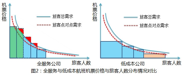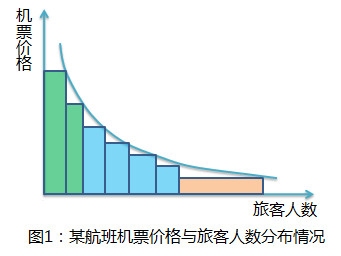 “价格歧视”是经济学概念,是指企业为获取更高的利润而对同一产品制定出不同的价格。从本质上说,同一个航班提供的主要服务差别并不太大(都是在相同的时间将旅客从A点运送到B点),但即使是乘坐同一航班的旅客在其他方面的需求也是各有不同(有的旅客追求舒适,有的希望便宜……),航空公司为了满足不同旅客的需求而将座位划分为提供不同服务(价格不等)的各个舱位,如图1所示,机票价格和旅客人数的函数大致是向右下方倾斜的曲线,不同的机票价格对应不同的旅客人数,航班总收益=Σ(机票价格*旅客人数),即图中不同矩形围成的面积总和,要想航班收益最大化,机票价格必须尽可能地细分,但多数情况下航空公司无法更好地细分机票价格,如全服务公司基本没有低价票,而低成本公司也几乎不销售高价票,他们不想使航班收益最大化?