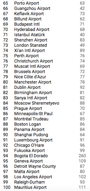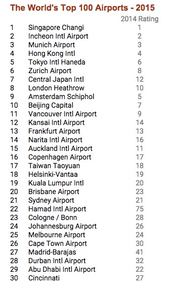 英国航空评级机构Skytrax发布的2015年世界前百位的主要机场排名