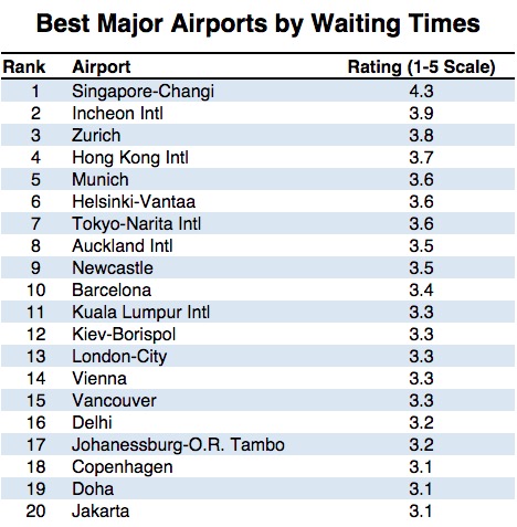 Skytrax报告数据中,等待时间被从1-5区间打分,分数越高,时间越短。获得前两名的仍旧是樟宜机场和仁川机场,而香港国际机场位列第四。同时,等待时间最短的20家机场,也占据了总排名前20的15席。