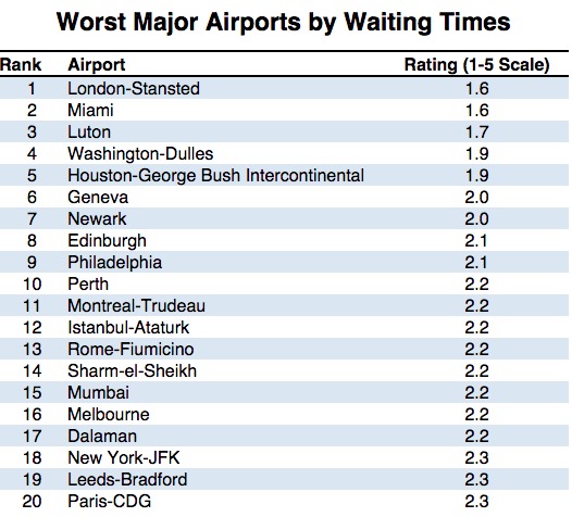 伦敦斯坦斯顿机场则被评为世界等待时间最长的机场,而爱丁堡机场,虽然综合评分并不低,但却是全世界主要机场中等待时间第8长的。许多用户抱怨称机场的值机和安检队伍太长。
