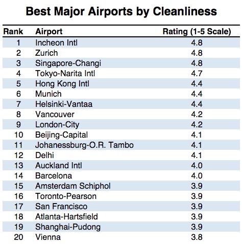 负责国际旅行,并且有公共场所如厕所、餐厅等,机场的清洁程度决定了疾病传播的可能性大小,因此Skytrax和priceconomics将机场清洁度也纳入了考量范围。仁川机场在清洁度上以些微优势战胜苏黎世机场和樟宜机场,位列第一。东京成田机场第四,香港国际机场依旧榜上有名,而北京首都机场排名第10。