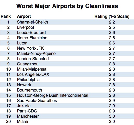 另一方面,“荣获”差评的世界主要机场中第一脏乱差的是埃及沙姆沙伊赫机场。而英国和美国机场几乎占据了脏乱榜前20名的一大半。广州机场被排在了脏乱榜的第9位(然而这并不是件光荣的事情)。
