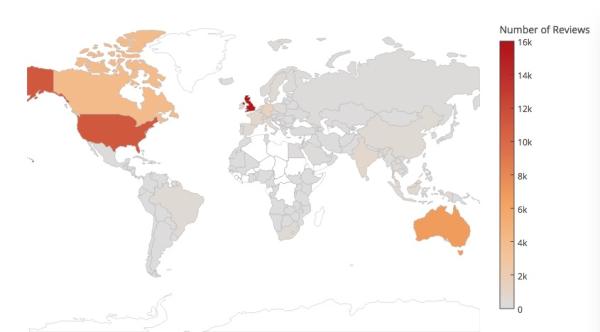 Skytrax给出的图表显示,给出评分的用户大部分来自英美,其次是澳大利亚、加拿大和部分欧亚国家地区,以及非洲。
