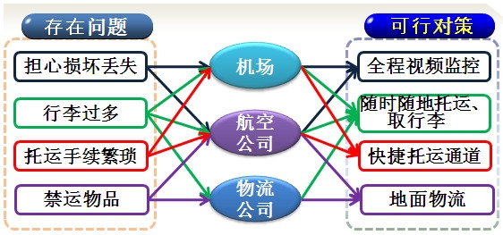 其实虽然有难度,但航空公司完全可以通过整合各方资源改进流程,让旅客能够轻装出行,比如若旅客担心行李丢失或受损,不妨努力提高行李托运的安全性并利用航空公司及机场的监控向旅客提供全程透明的行李托运过程,让旅客在候机楼、客舱的屏幕上乃至手机上都可以实时监控自己的行李动态,从而可以放心把行李交给航空公司;如果旅客携带行李过多不方便随身携带,航空公司可以与机场及物流公司展开合作,争取让旅客在市区候机楼乃至酒店就可以提前托运行李,到达目的地后也可不必在机场等待行李,而是付费让当地物流公司送货上门;对于担心行李超重的旅客,航空公司可以提供丰富的超重行李套餐,如果旅客预计行李可能超重,可以在网上提前购买(比现场更为优惠的)行李套餐;航空公司可以在安检口附近设置快捷托运通道或自助托运通道,方便旅客临时托运不允许带到客舱上的行李;无法通过安检的航空禁运物品往往只能丢弃,或者要冒着赶不上飞机的风险处理行李,航空公司也可以协调物流公司在安检口附近提供地面运输服务。