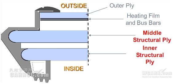 驾驶舱的窗户有前风挡、侧滑窗、固定窗共6块窗户组成,典型的窗户分为外层、中间结构层,内部结构层以及加热层,外层用来保护加热元件,不承担结构作用。如图所示。