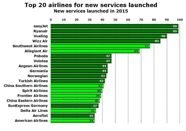 欧洲地区的新增航线最多。欧洲四个主要的低成本航空公司在新增航线方面属于领先者,它们的新增航线数量要比全球任何其它航空公司都要多。瑞安航空与易捷航空各新增了99条航线,而伏林航空和匈牙利的低成本航企威兹航空各新增了90条和85条航线。美国西南航空(新增77条航线)和忠实航空(新增69条航线)紧随其后。