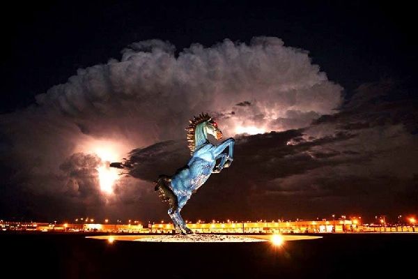 旅客到达丹佛国际机场(DIA)时会看到一座约10米高的“蓝野马”雕塑,它拥有一双令人生畏的红色眼睛。这座4吨重的雕像建于2008年,由新墨西哥艺术家路易斯•吉梅内斯设计,安装在通往机场的主干道——尼亚大道上。