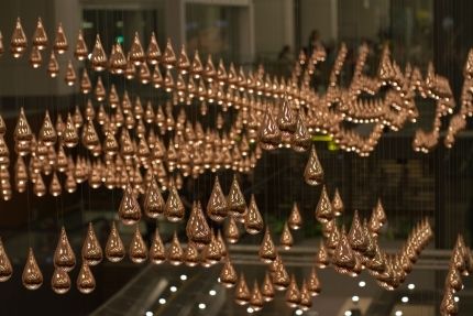 樟宜机场的“雨之舞”亮相于2012年,由德国公司Art+Com设计,据称是世界上最大的动态雕塑。它由1216颗青铜制成的水滴组成,通过机动滑轮固定在1号航站楼大厅天花板上。