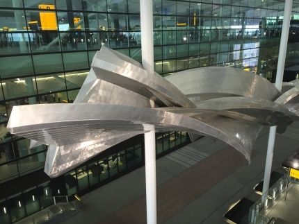 希思罗机场的“气流”雕塑于2014年4月与公众见面,它悬空在2号航站楼大厅上方18米处,重达77吨,由多达23个独立部分构成。“气流”是英国艺术家理查德•威尔逊的作品,其灵感来自于Zivko Edge540特技飞机的飞行表演。