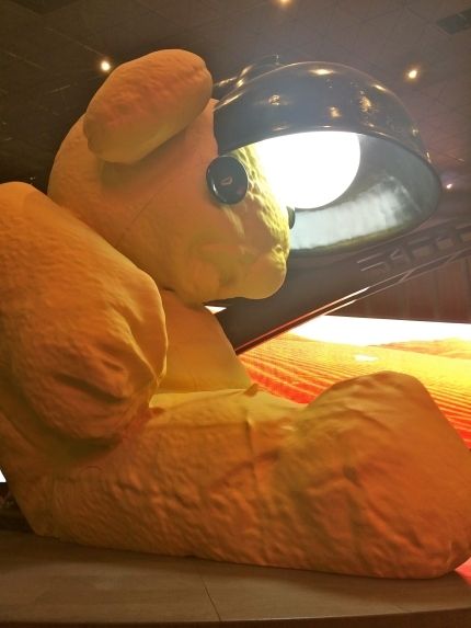 这只黄色泰迪熊高约7米,重约20吨,由瑞士艺术家乌尔斯•菲舍尔创作。它是一座彩绘青铜雕塑,官方命名为“无题(灯泡/熊)”。