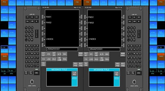 通过对多种显示画面布局进行了对比分析,权衡了触摸屏替代中央控制台和顶板机械组件的方案,并对15寸以上超宽显示屏、超薄曲面屏在驾驶舱中的应用可行性初步实验,在综合考虑目前显示器制造工业水平等因素的基础上,提出并实现了“3+1”(前仪表板上3块21英寸屏幕,中央控制台上1块18.5英寸屏幕)的布局方案并取消了光标控制装置、多功能键盘等硬件设备,顶板和中控台采用全触摸的方式,侧面辅以电子飞行包和监控屏幕组成了全玻璃化的驾驶舱。
