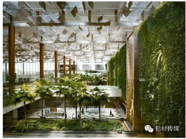在机场的内部,有一个垂直花园叫作Green Wall,花园里有超过20种植物,墙面上有葡萄藤和各式花朵。