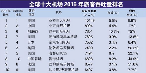 17年来,美国亚特兰大机场一直是全球最繁忙的机场。其2015年的旅客吞吐量仍然保持了5.5%的增速,并突破了1亿人次大关,成为全球首座旅客吞吐量上亿的机场。北京首都机场旅客吞吐量为8994万人次,连续6年排第2名。其旅客吞吐量比2014年增长了4.4%,略低于亚特兰大机场5.5%的增速。