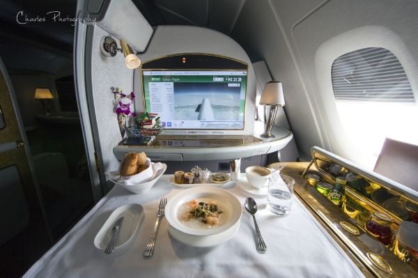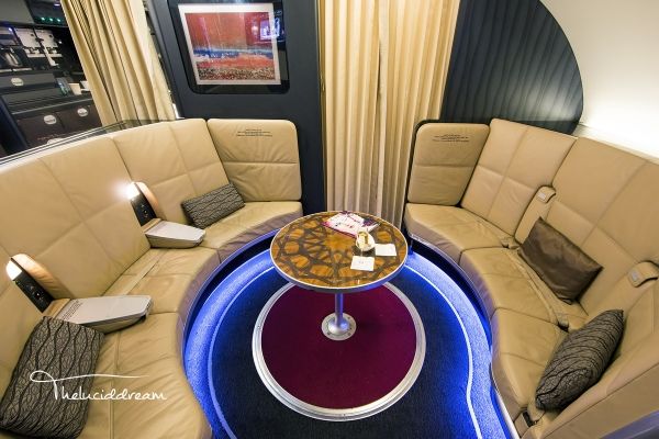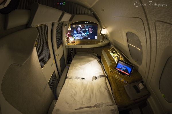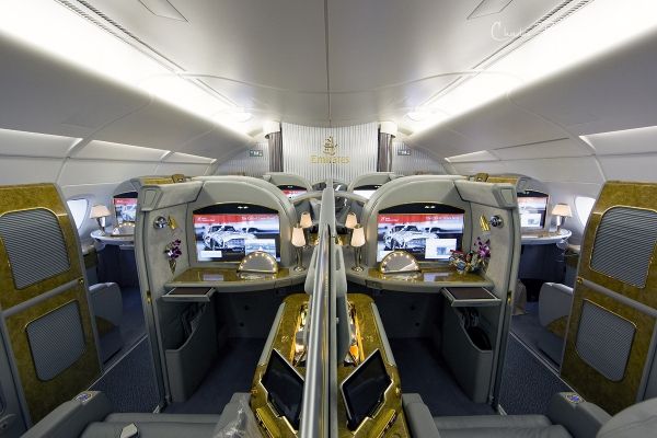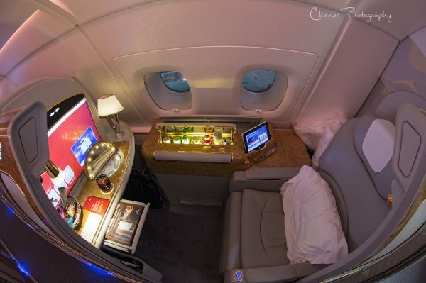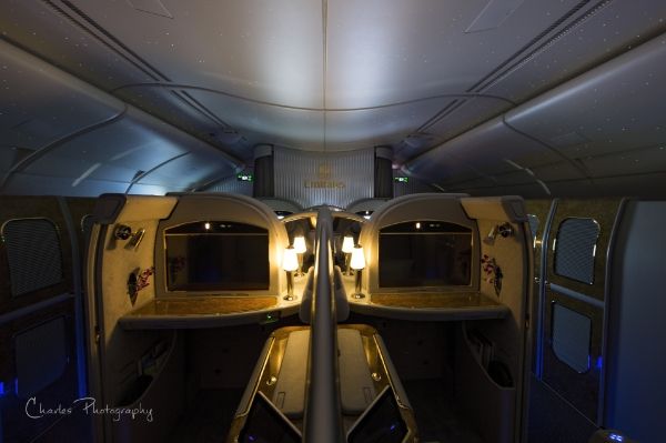 2008年阿联酋第一架A380客机交付使用,经过改良的头等舱包厢也被搬上了客机,EK的A380头等舱位于上层客舱前部,共14个座位。
