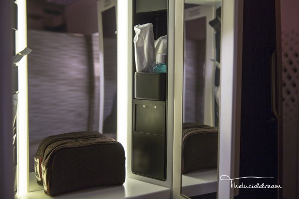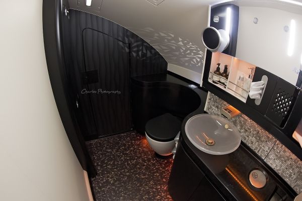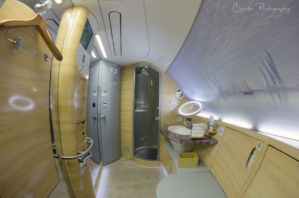 EK是第一家将浴室概念引入飞机客舱的航空公司,随后开始被数家公司效仿。浴室位于头等舱前部,左右各一间,航班上还专门配备了Spa Attendant。通常每位乘客限时五分钟水量,可控制暂停,如果航班上乘客不多,多洗一会也没关系。