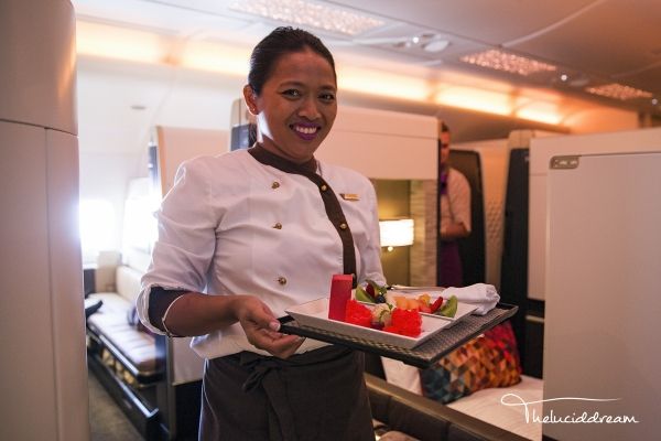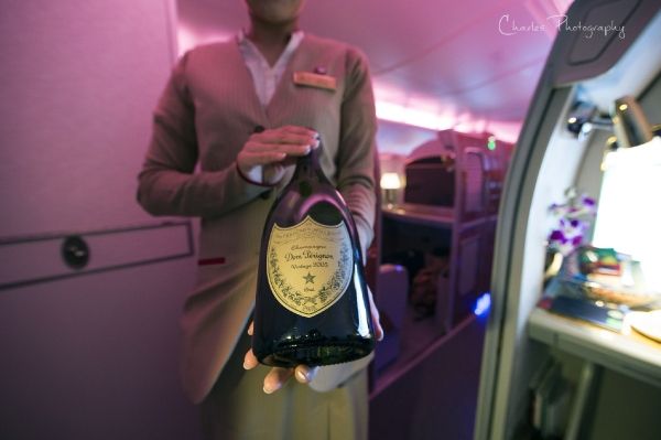 虽然如今EK也开始四处削减运营成本,但公司依旧保证了头等舱的质量,航班上提供2005年Dom Pérignon香槟。餐食虽不算精致,但分量十足(除鲟鱼子酱),基本上一餐饭可以坚持十个小时。