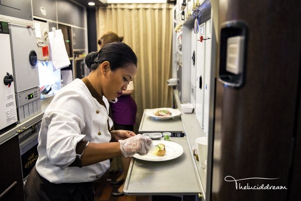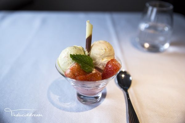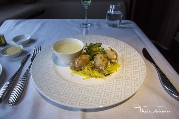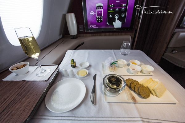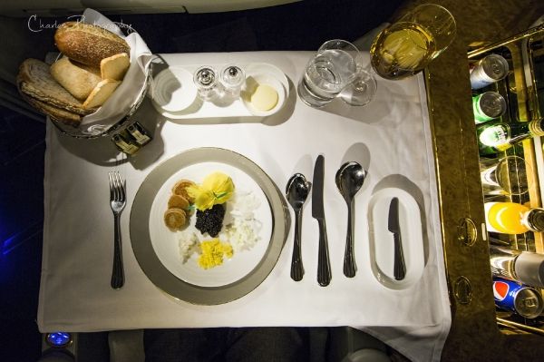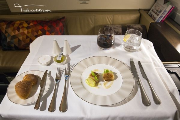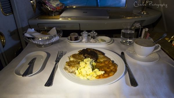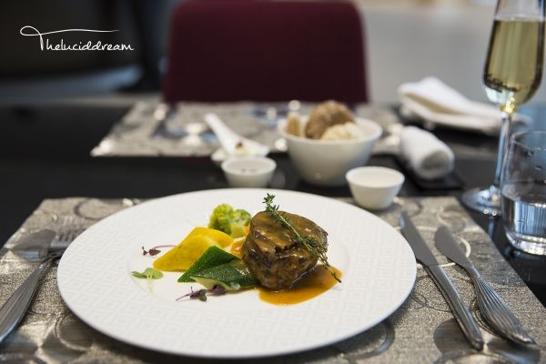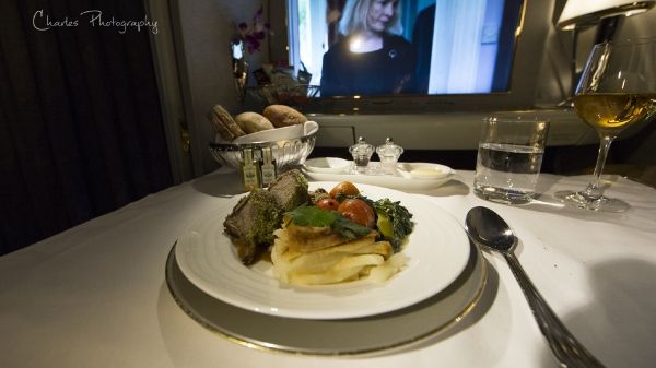 阿提哈德航空为头等客舱配备了随机厨师,相对于另外两家公司,厨师的出现可以更灵活的满足乘客的对餐食的特殊需要。头等舱餐食选材较阿联酋航空及卡塔尔航空略低,例如比Dom和Krug稍逊色的香槟,不提供鲟鱼子酱等。餐食的质量也不是很稳定,忽好忽坏,可能取决于厨师的心情吧!下图是我最近一次从阿布扎比飞往伦敦的航班上的餐食,可以给满分。